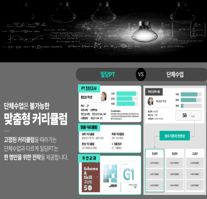 밀당PT 수업 수많은 학생들을 대상으로 하지만 담당선생님이 아이들 한명 한명 케어를 해주시고 취약점을 오랜 경력의 담당쌤과 AI가 분석해서 그에 맞는 솔루션을 정확하게 내려 줍니다.