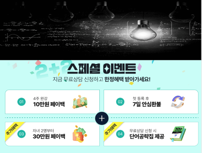 쌍둥이라 교육비도 다른집보다 2배씩 들어가는데 온라인과외인 만큼 일반 과외보다 수업료도 저렴하고 7일동안 안심환불 기간도 있고 단어공략집 제공 자녀2명부터 30만원 페이백과 4주완강시 10만원페이백등 다양한 혜택이 주어지니 수학과 영어에 자신없는 학생들과 걱정하시는 학부모님들은 관심 가져 보셨으면 해요.