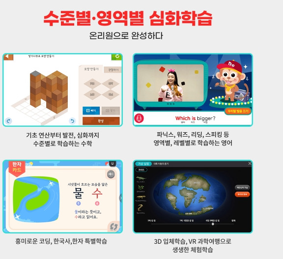 온리원 초등은 아이들의 심리나 성격과 주의력을 진단하여 아이들의 학습 수준과 레벨을 진단한 이후에 진단에 맞는 1:1 맞춤 시간표를 통해서 학습하고, 학년별로 과목별로 멀티미디어 학습을 통해서 배우게 됩니다.