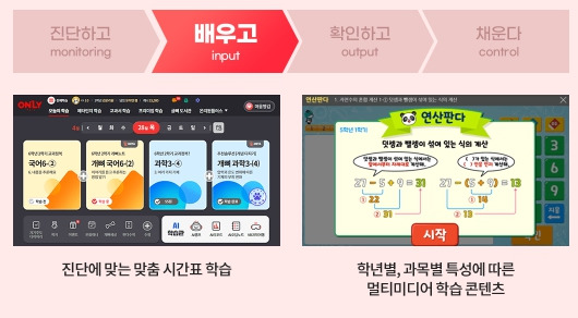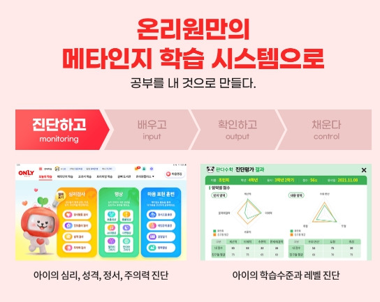 온리원 초등은 메타인지 학습을 중점으로 모니터링, 배움, 아웃풋, 채우는 학습 시스템으로 학습한 내용을 온전히 내 것으로 만드는 과정을 거칩니다. 메타인지 학습 솔루션은 특허로 검증된 업계 유일한 학습법이니 꼭 경험해보세요.
