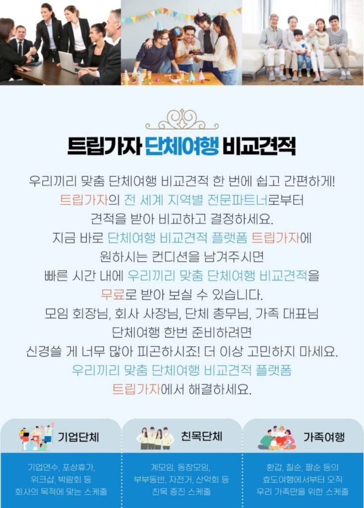 지금 바로 단체 여행비교견적 플랫폼 트립가자에 원하시는 컨디션을 남겨주시면 빠른 시간 내에 우리끼리 맞춤 단체여행 비교견적을 무료로 받아보실 수 있습니다.