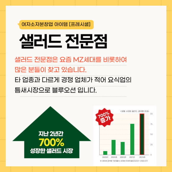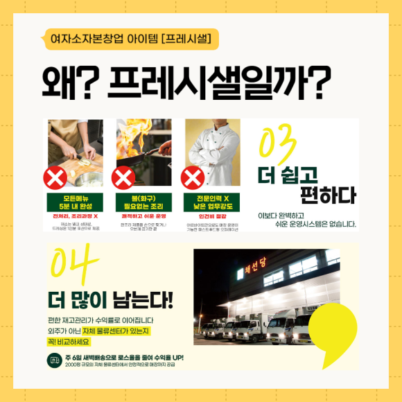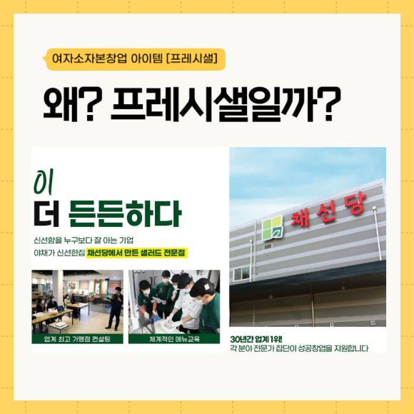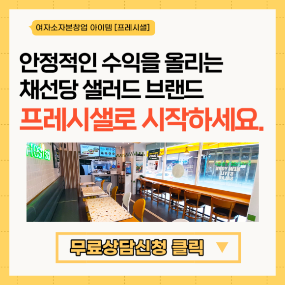 정해진 돈으로 시작하는데 많은 돈을 벌 수 있다는 것이 말이 될까요? 몸으로 뛰라는걸까? 생각하실 수도 있겠지만 대표적인 예시로 프레시샐은 채선당의 샐러드 브랜드입니다. 야채가 신선한 특징을 잘 살린 곳이라고 분석할 수 있습니다.