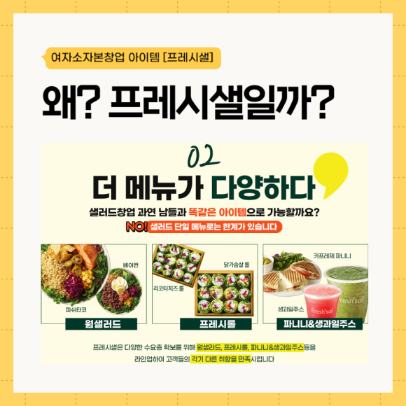 즉, 복잡한 제조 과정을 생략하고 충분히 혼자서도 매장 운영이 가능해야 한다는 것인데요. 프레시샐은 10평 내외의 소형점포로써 1인 혹은 2인 창업이 가능하기도 하며 매장 크기가 클 필요가 없어서 다양한 상권에도 수월하게 입점할 수 있다는 장점이 있어요. 특히나 뉴요커가 사랑한 샐러드를 국내에 소개하여 타 샐러드 브랜드와의 큰 차별점이 있어 더욱이 경쟁력이 있는 브랜드라고 볼 수 있겠죠.