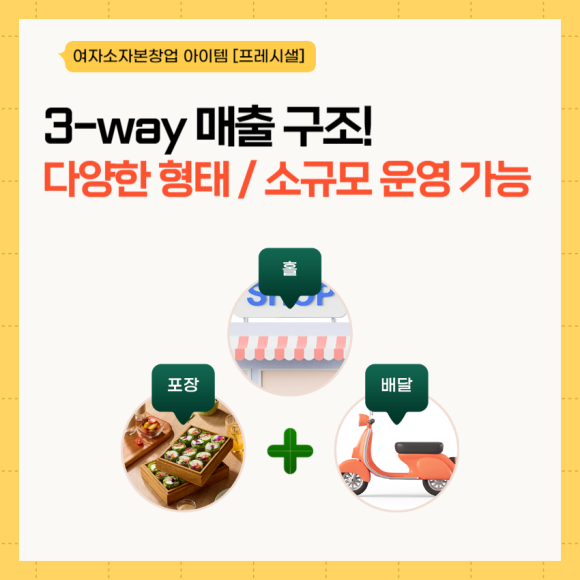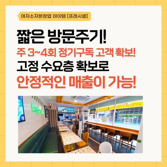 매장의 크기도 작게 운영 가능하고 업무에 대한 강도가 낮기 때문에 직원을 추가 고용하지 않아도 되기 때문에 인건비가 적게 들어간다는 점! 그렇기에 조리에 불을 사용하지 않아서 위험도도 낮고 빠르게 조리가 가능하다는 점에서 그렇기에 충분한 자본금이 없더라도 본사를 통해서 가맹비부터 다양한 지원을 받을 수 있기에 소자본만 있더라도 시작할 수 있는 좋은 ITEM이기도 합니다.