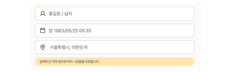 사주를 보기 위해서는 본인의 정보를 입력해야 합니다. 이름, 성별, 생년월일, 태어난 시간, 태어난 도시를 입력해주세요. 포스텔러 만세력에서는 서머타임 등의 시간 변화나 특정 지역에 따른 미세 시차까지 보정하는 옵션을 제공하고 있습니다.