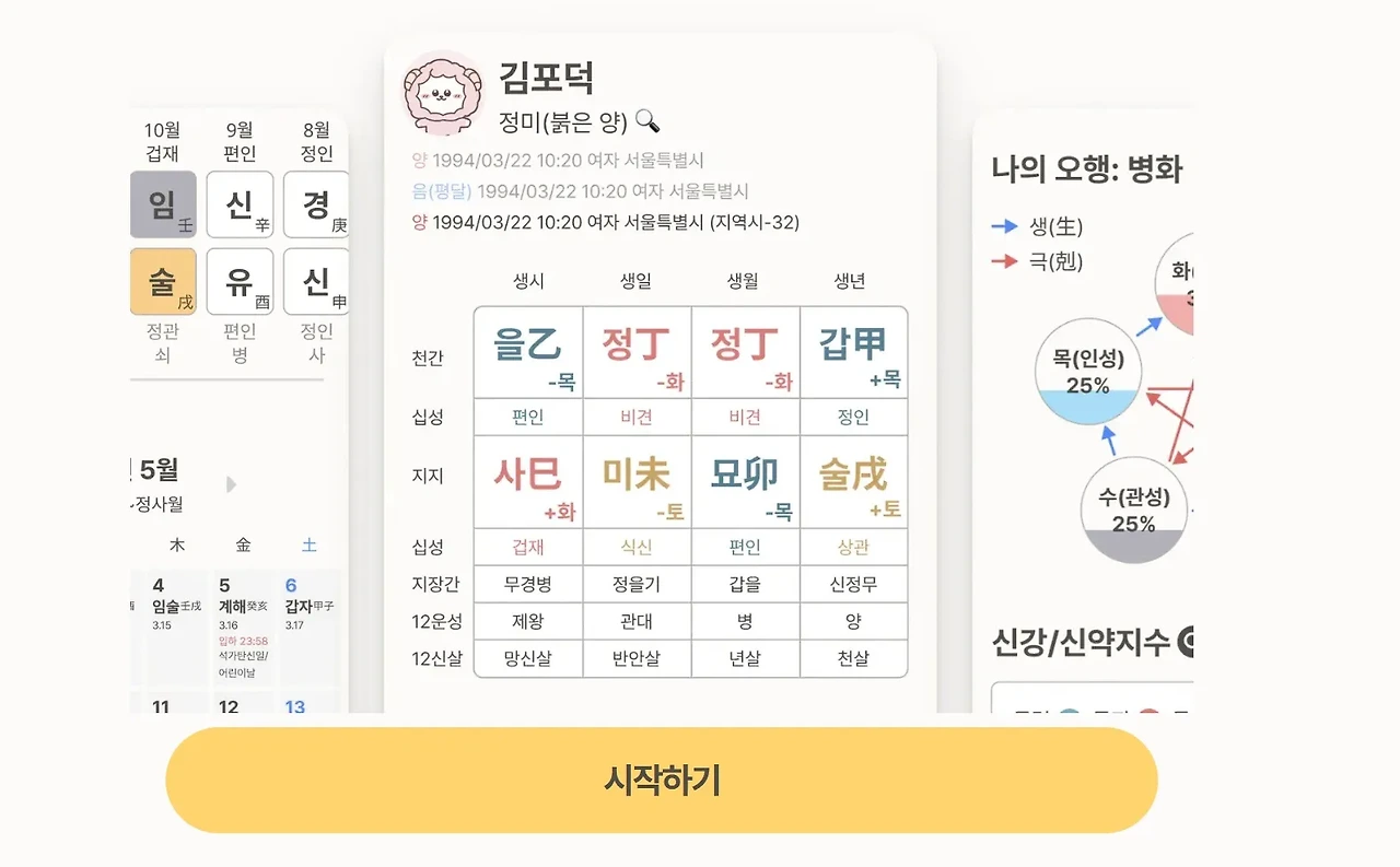 또한 대운수와 일진달력도 확인할 수 있는데요. 평소 사주풀이에 관심이 있는 분들이라면 아주 재밌게 즐길 수 있을 거 같습니다.