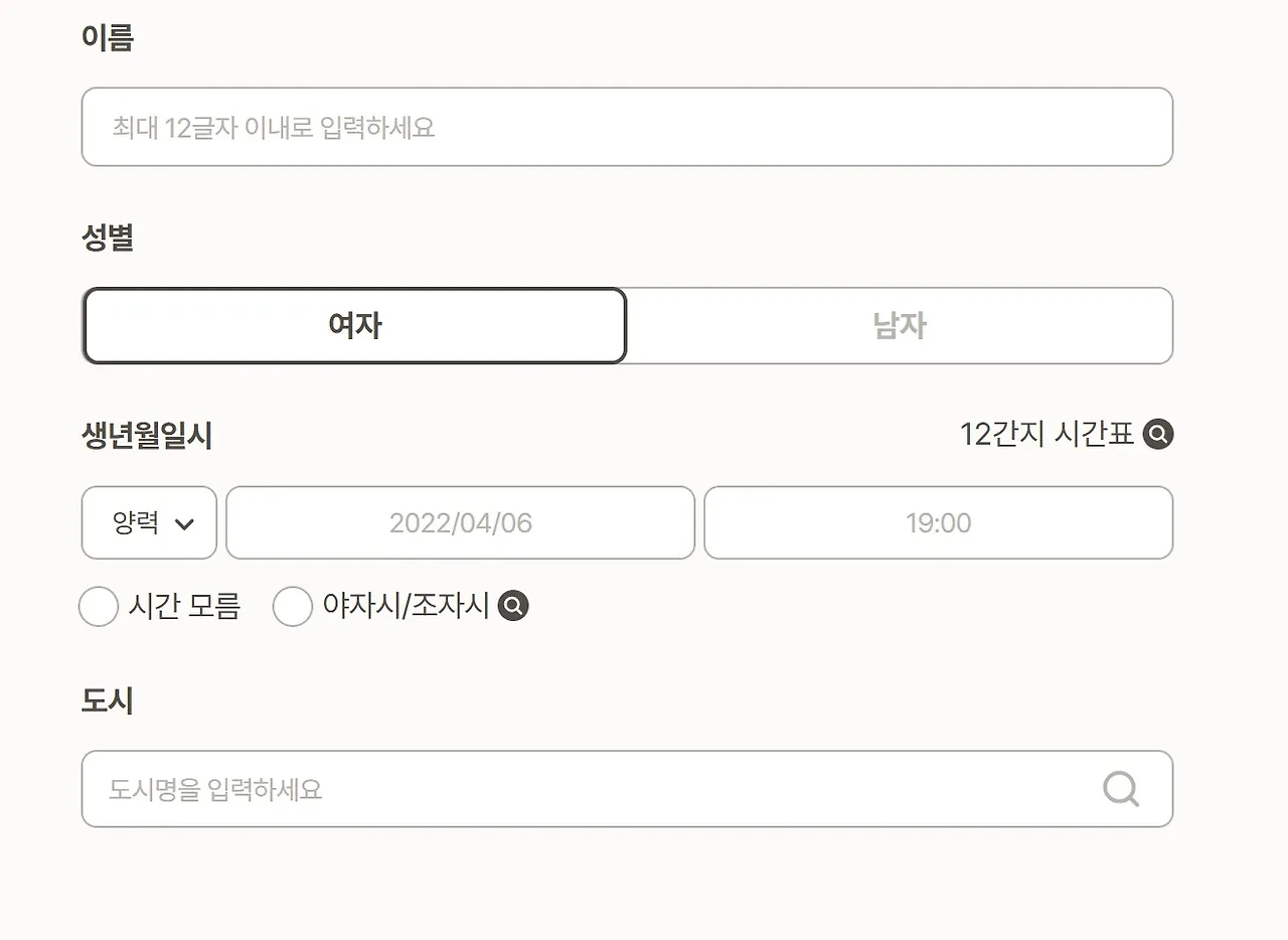 우선 포스텔라 만세력은 무료로 사주를 볼 수 있다는 장점 외에도 이름, 태어난 연월시, 성별, 그리고 지역까지만 입력하면 아주 간단하게 사주풀이가 되어 나온다는 점입니다.