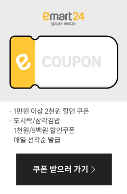 | 이마트24 | NO. 1브랜드 상품 최대 1+1행사, ~20%쿠폰, 매장 방문시 ~80% 랜덤 쿠폰 |