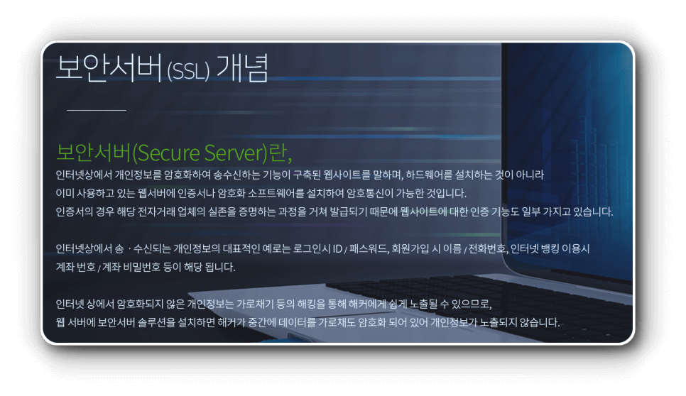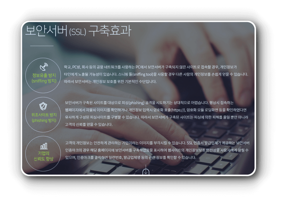 공용 네트워크를 사용하는 학교, PC방, 회사 등 에서 PC를 통해 보안서버가 구축되지 않은 사이트로 접속할 경우 개인정보가 타인에게 쉽게 노출 될 수 있습니다. 따라서 보안서버는 개인정보 유출을 방지하기 위한 기본적인 수단입니다. 보안서버가 구축된 사이트를 대상으로 피싱 공격을 시도하는 것은 상대적으로 어렵기에 고객의 신뢰를 얻을 수 있으며, 고객의 정보를 안전하게 관리하는 기업이라는 이미지도 부각 시킬 수 있습니다.